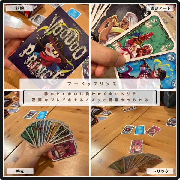 勝ちたくないし負けたくないトリテのブードゥプリンス。3トリック獲得で脱落。最後の方まで残りたいけど、最後まで残っていると旨みが少ない。迂闊なプレイをしていると予期せぬところで、スッと脱落させられる仕組みが良い緊張感を生み出している。
