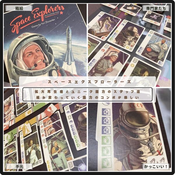 ユニークな能力を持ったスタッフを集めてロケットを開発するスペースエクスプローラーズ。 プレイ感は王道の拡大再生産だが資源巡りに特徴がある。またスタッフの能力によるコンボがあるが、それがプレイ中に組み変わっていくのが面白い。