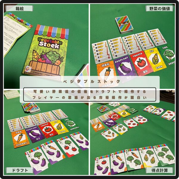 可愛い野菜達の価格を操作するベジタブルストック。 ドラフトで野菜を入手、場に余る1枚に描かれた野菜の価値が上昇。でも暴落してしまうこともある。シンプルなドラフトを6回で得点計算。皆の思惑が垣間見える市場操作が面白い。