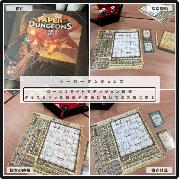 ロール&ライトでダンジョン探索するペーパーダンジョンズ。 ダイスをキャラ成長やマップ移動、アイテム獲得に使用しつつ3体のボスとの戦闘に臨む。プレイヤー毎にパーティ特徴が異なり進め方は様々。プレイ後の振り返りもしっかり楽しい紙ペンの一作。
