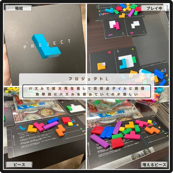 パズルの完成と報酬によるピースの獲得で高得点パズルに挑戦するプロジェクトL。 完成させやすい白タイルから高得点だが手間がかかる黒タイルへの着手するタイミングが悩ましい。ピースが潤沢になってから一気にタイルを完成させていけるのが爽快。