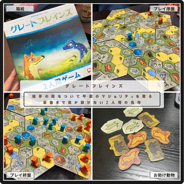 相手の隙をついて勝利を掴むグレートプレインズ。 交互にコマを配置、黄色エリアで過半数を抑えれば勝利点が獲得できる。詰めれたと思っても意外と抜け道があって、流れを覆されることもあって、最後まで気が抜けない。3種のお助け動物の活用も楽しい2人用の名作。