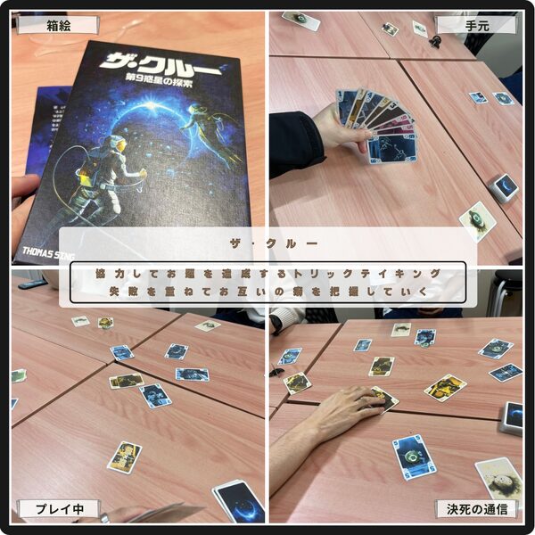 互いに意図を読み解き、協力してお題を達成するトリテのザ・クルー。 仲間の意図を汲んでカードを出す連帯感、テーマに沿ってミッションをクリアしていく達成感が魅力。失敗を重ねてお互いの癖を把握して、場を支配するトリテの冥利を皆んなで味わえる。