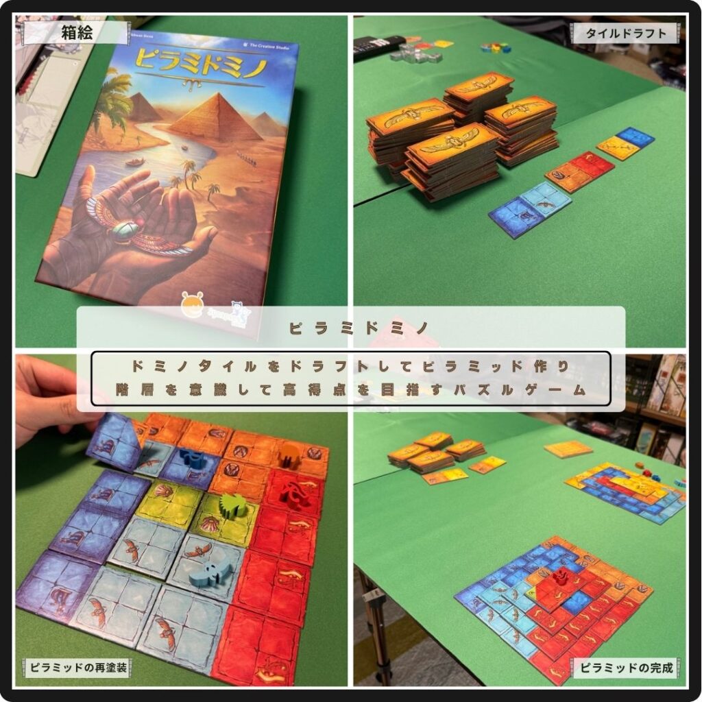 3つのドミノタイルから1つ選んで手元に配置して4層のピラミッドを作る。色ごとに塊にして、アイコンを集めると得点が伸びる。下層のアイコンは継続的に得点をもたらしてくれる。