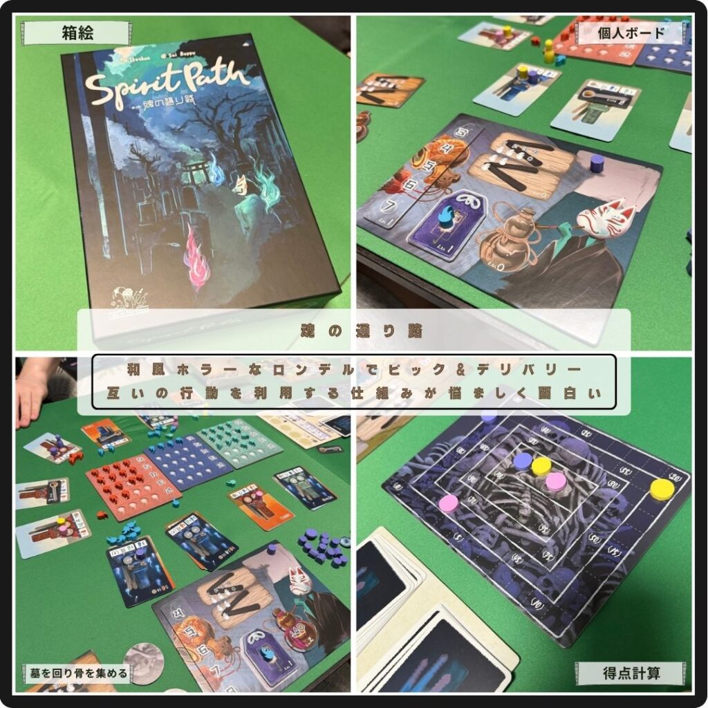 リソース変換できるお墓を回り勝利点を集める。リソースは各プレイヤーの共有物で、狙いのものが運ばれてしまったり、運び込まれてくる。お墓に置いた供物コマを回収できると能力改善チャンス。
