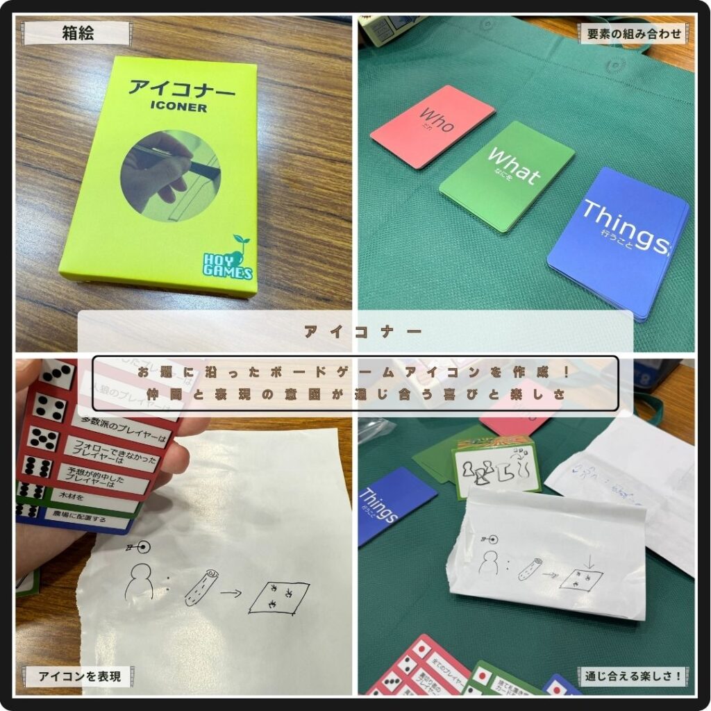 お題に沿ってボードゲームアイコンを作成。互いに当て合うアイコナー。”だれ・なにを・行うこと”の3要素の組み合わせでお題が指定される。各自、お題を表現したアイコンを作成して提示。どんなお題だったのかお互いに当て合う。 これはボードゲーム好き同士で盛り上がれる作品。これどうすればいいんだ?って時も何とか表現を捻り出す。皆同じような状況だから、互いに意図に気づき合えた時の喜びと嬉しさは格別。