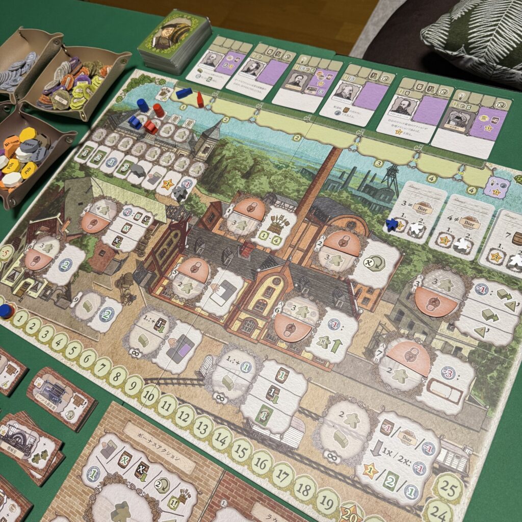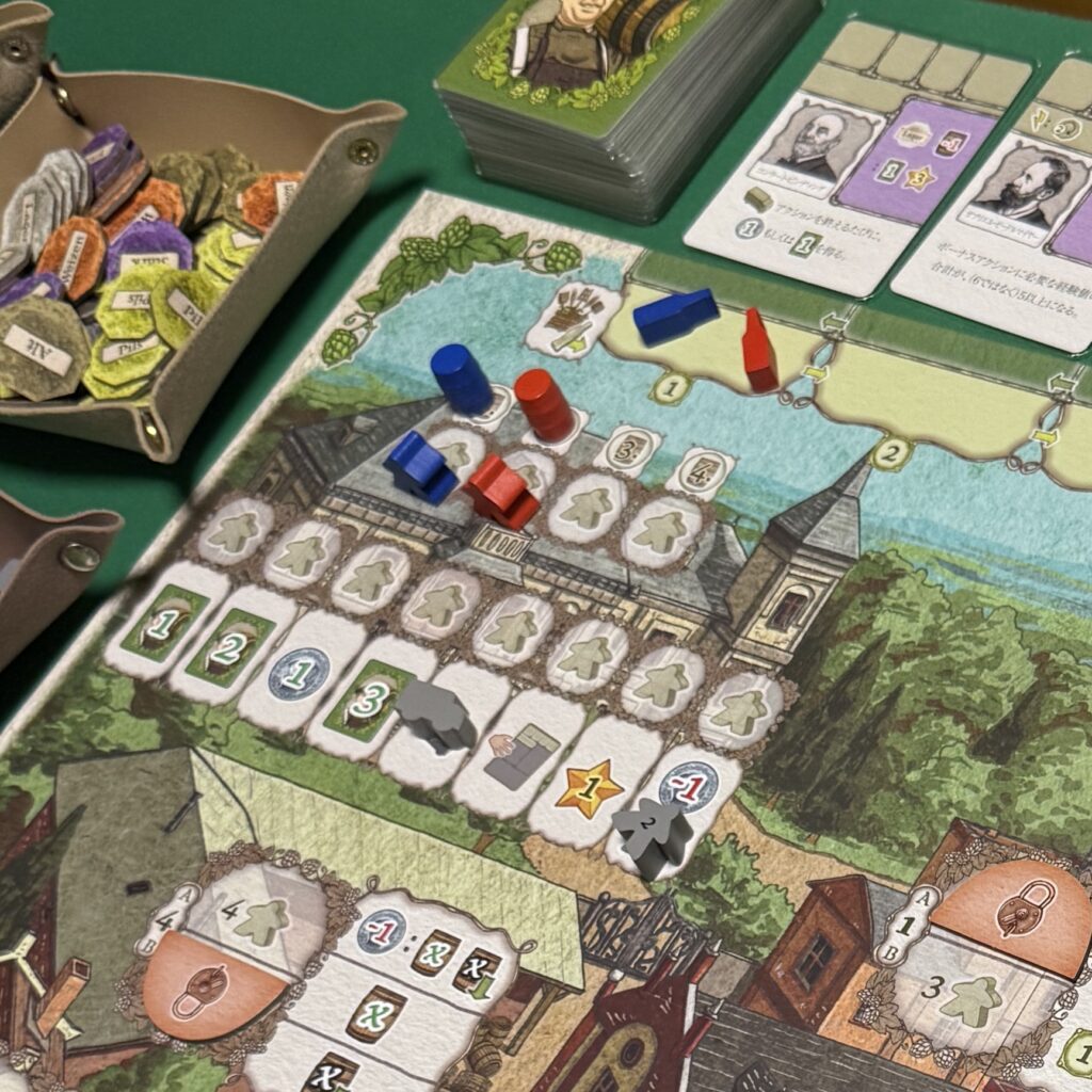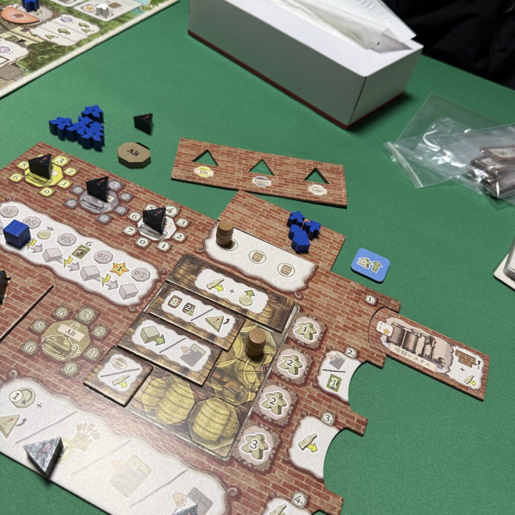ビール醸造家として、自家醸造所を発展させながら、カードに指示されるビールを揃えて出荷することで勝利点を集めていきます。冷却機やろ過装置などの導入、経験豊富な労働者を雇用してアクションを効率化させながら、誰よりも早く20勝利点集めることを目指します。