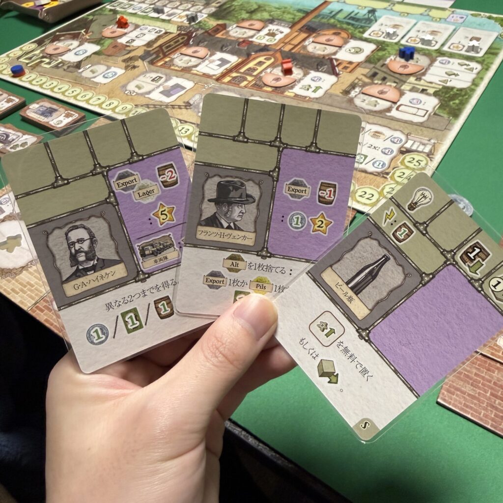 ゲーム開始時に配られるカードから方針を考えてみる。Exportビールが出荷しやすそうなので、まずはその準備を整える方向でプレイ。カードの”ビール瓶” は薄茶色セクションが強いので、自分の能力改善用にする。