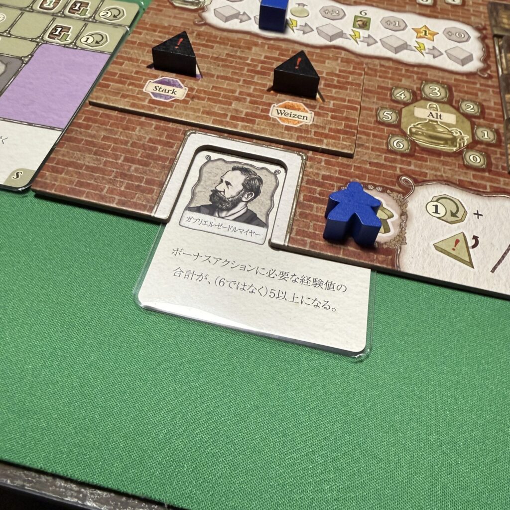 中盤に差し掛かる少し前くらいに、自分に恒常的な能力を付与してくれる熟練者カードを1枚プレイ。ガブリエルさんは、労働者アクションのボーナスアクションを発動させやすくしてくれる。これで自分は労働者駒の雇用に手番を割かなくても、ボーナスアクションを使いやすくなった。中盤からはボーナスアクションを組み合わせて、更なる施設改良と自分にマッチしたビール配達条件のカードの入手に奔走。