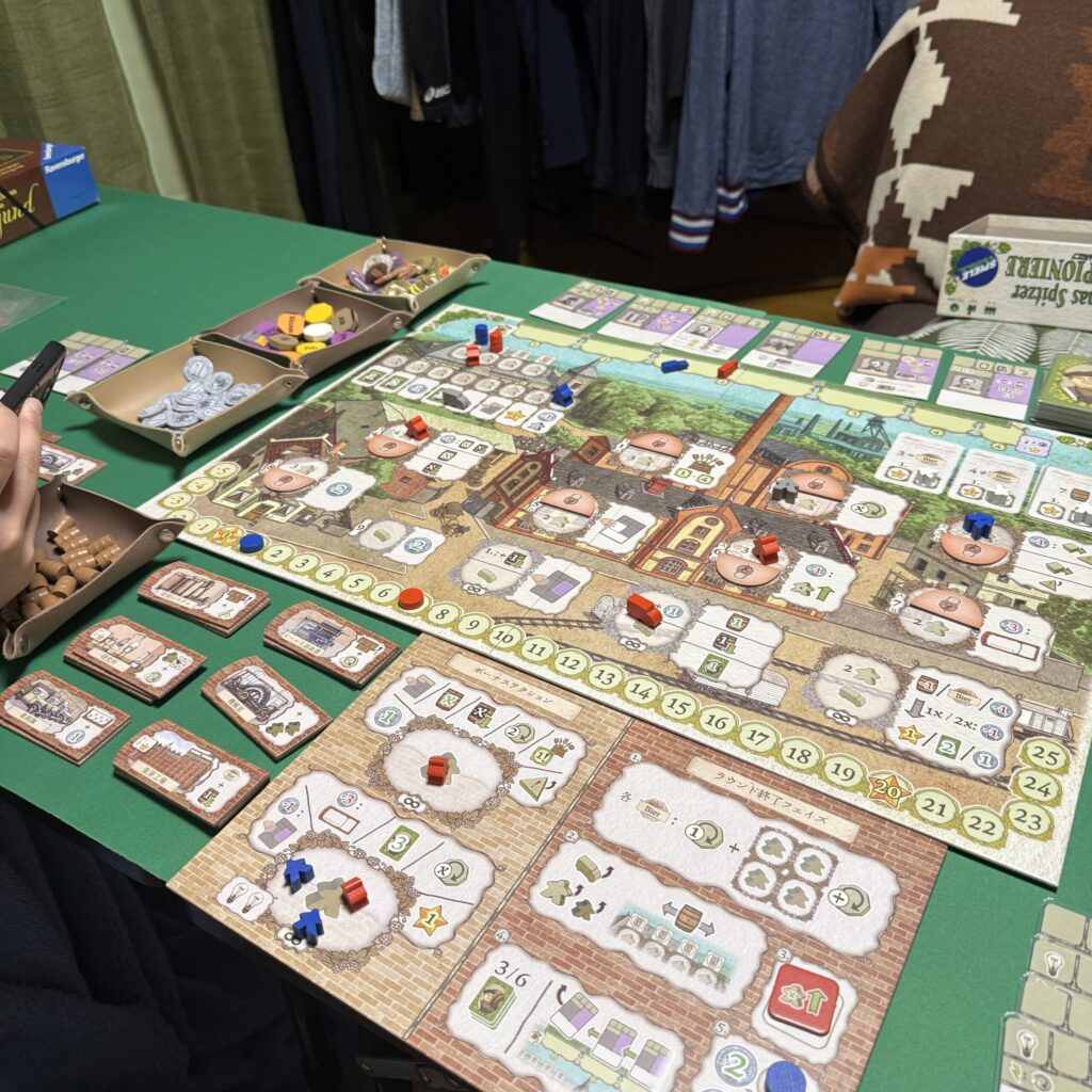 ビールの出荷準備に自身が頭を悩ませえている頃、相手は着実に勝利点を刻んでいた。実は各拡張タイルの1枚目は1勝利点がついている。これが相手に4枚くらい取られていたのだ。この点差を覆す見通しは立っているつもりだが、ジリジリと点差が開いていくのは不安になる。