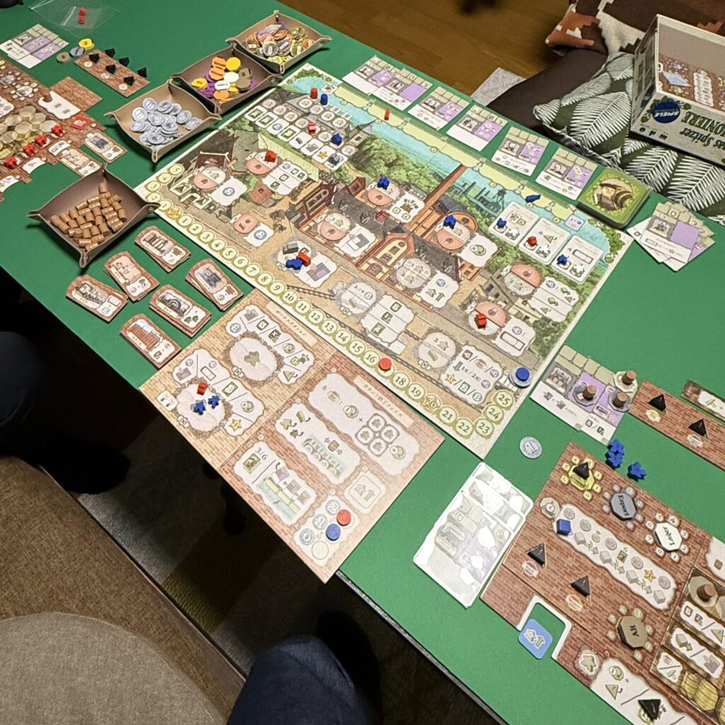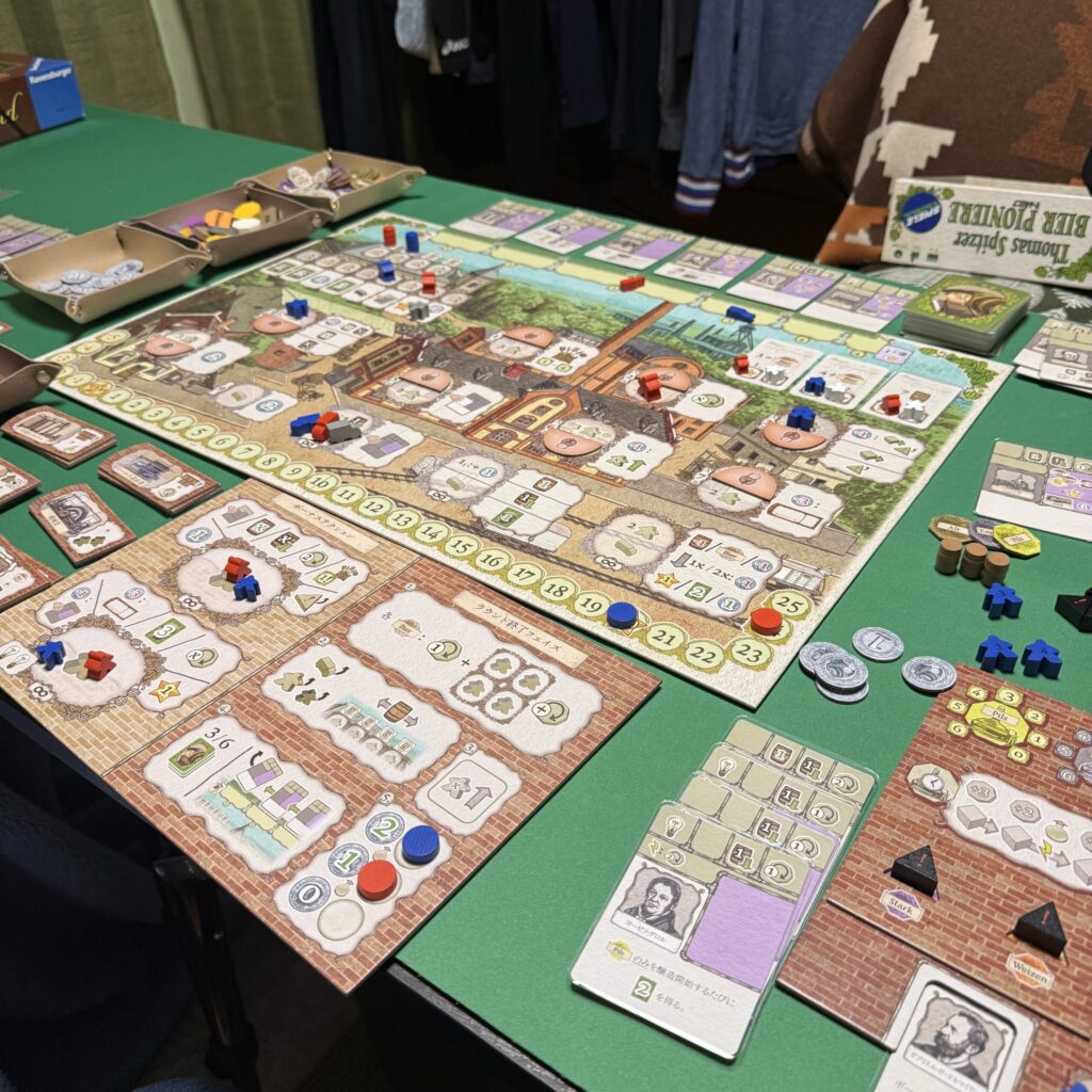 これで勝負に勝てるか??と思っていたが、結果は相手に先を越されて結構な点差をつけられて負けてしまった。3つあるうち2つの共通目標を達成されて6点取られてしまっただけでなく、相手はカードの白色セクションの効果も駆使して、ビールを無駄なく勝利点に変えて20点超えて24点までその勝利点を伸ばしていた。