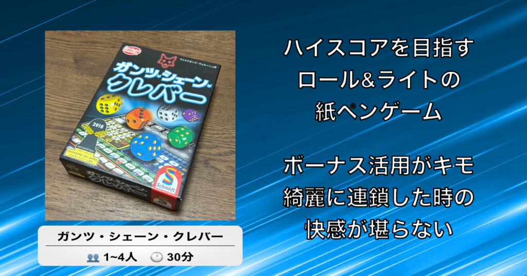 👥プレイ可能人数:1~4人 🕐プレイ時間:30分 📃ゲーム紹介:ダイスピックして手元のスコアシートに記入しながらハイスコアを目指す"ガンツ・シェーン・クレバー"。ロール&ライトの紙ペンゲーム作品です。ダイスを選んだら、チェック方法や得点条件が異なる5つのエリアいずれかにチェックしていきます。チェックしていくとボーナスが獲得でき、追加チェックができたり、振り直しやダイスピックをもう一度で実施できる権利が得られます。このゲームの醍醐味は何といってもボーナスの連鎖。ボーナスでチェックした箇所からさらにボーナスを入手して、またチェックしてボーナスを入手して...と連続してチェックが入った時の快感が堪りません。短い時間でサクッ遊べるし、やればやるほど連鎖の起こし方がつかめてくる!!今回はボーナス連鎖が気持ち良い紙ペンゲームの"ガンツ・シェーン・クレバー"のプレイログをまとめてみました。